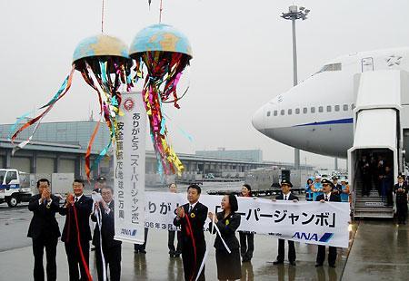記念フライトでは、就航した1979年の雰囲気を再現し、搭乗ゲートにて当時のユニフォームを着用した地上スタッフが復刻版の記念搭乗券を配布、機内ではスーパージャンボの就航に合わせ一新されたユニフォームを着用した客室乗務員とスーパージャンボのテーマソングである「シャイニイング スカイ」をBGMに、また機内オーディオも通常の番組を一部変更して当時のヒット曲メドレーにしたようです。また、鹿児島発羽田行きANA624便の乗客により到着後、機体に寄せ書きを行われました(でもどうやって寄せ書きするの?タラップからなのかな)